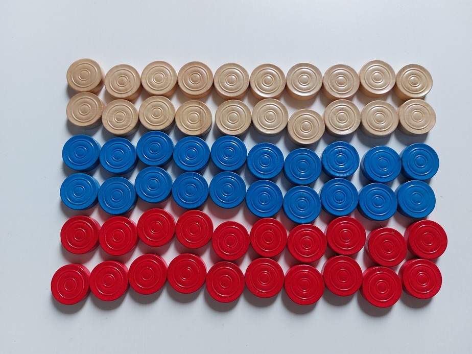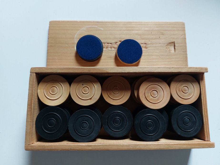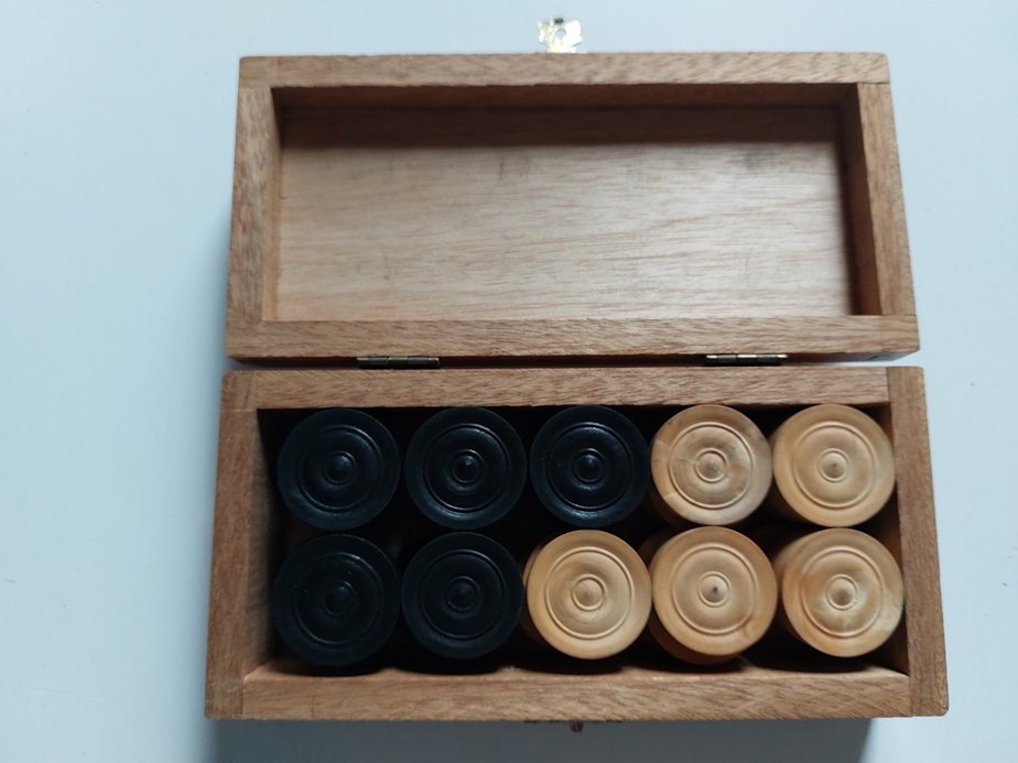 houten kistje met kleine houten Franse damschijven |