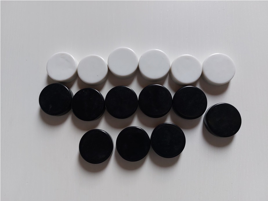 12 witte en 12 zwarte schijven, 6 doosjes aanwezig |